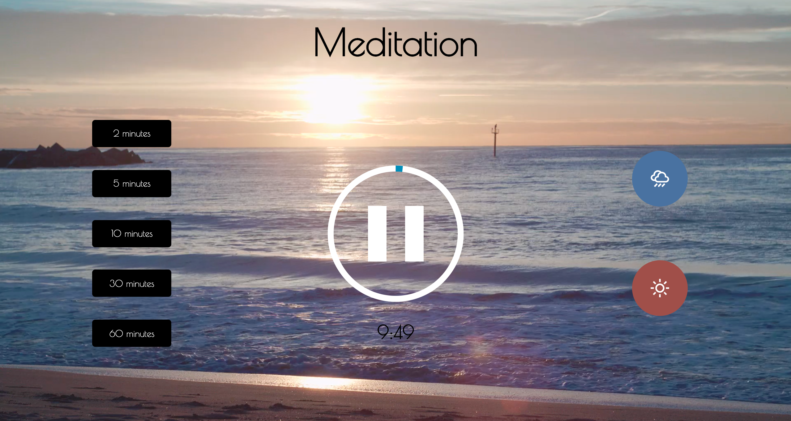An application that uses vanilla JavaScript to allow its user to select a duration and environment to meditate in.